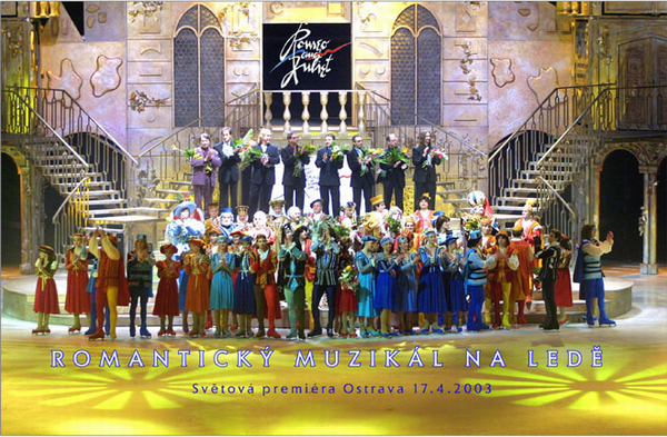 | 17.4.2003 Spatřilo naše dílo světlo světa. Na pódiu nahoře tvůrci, dole všichni herci a bruslaři.